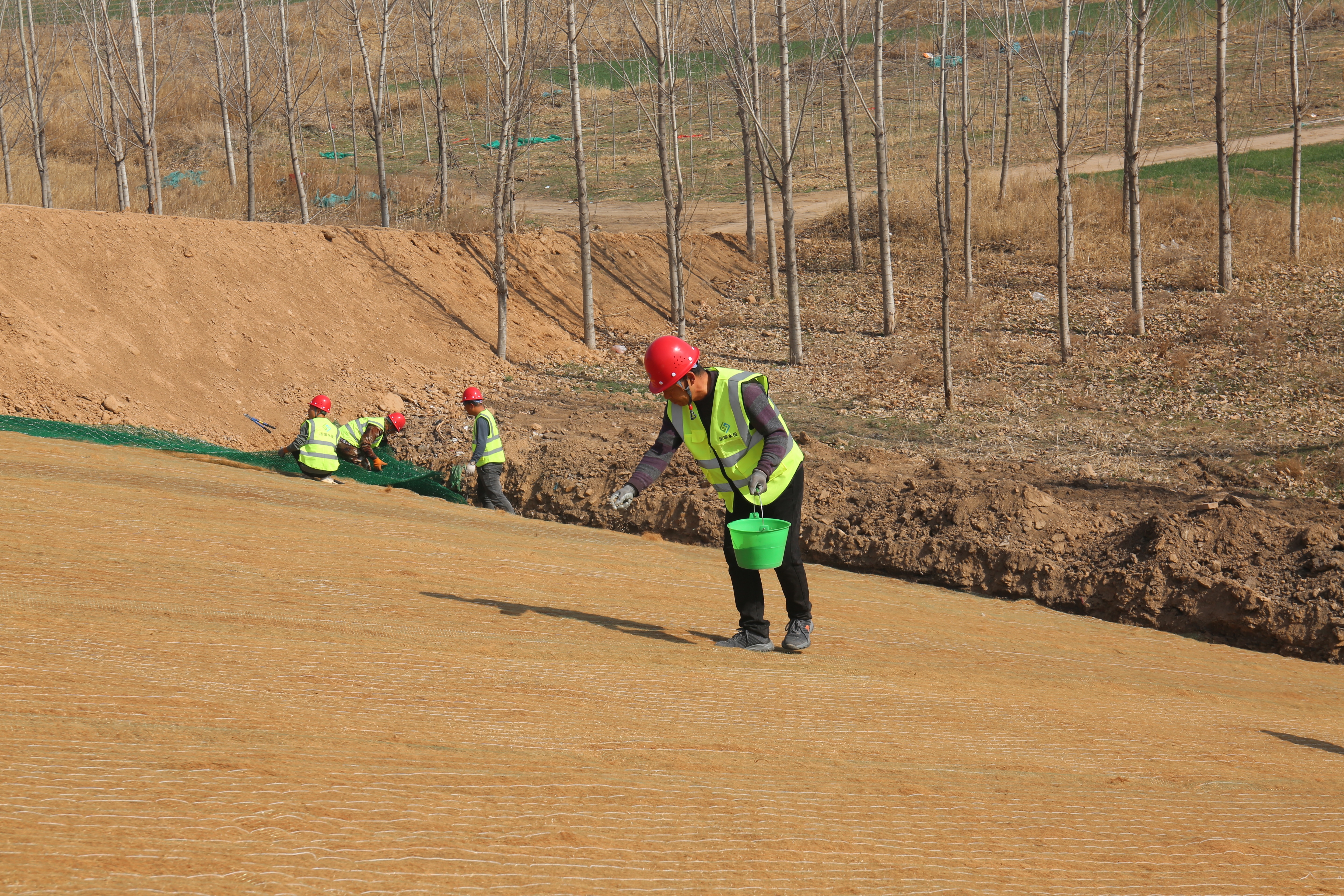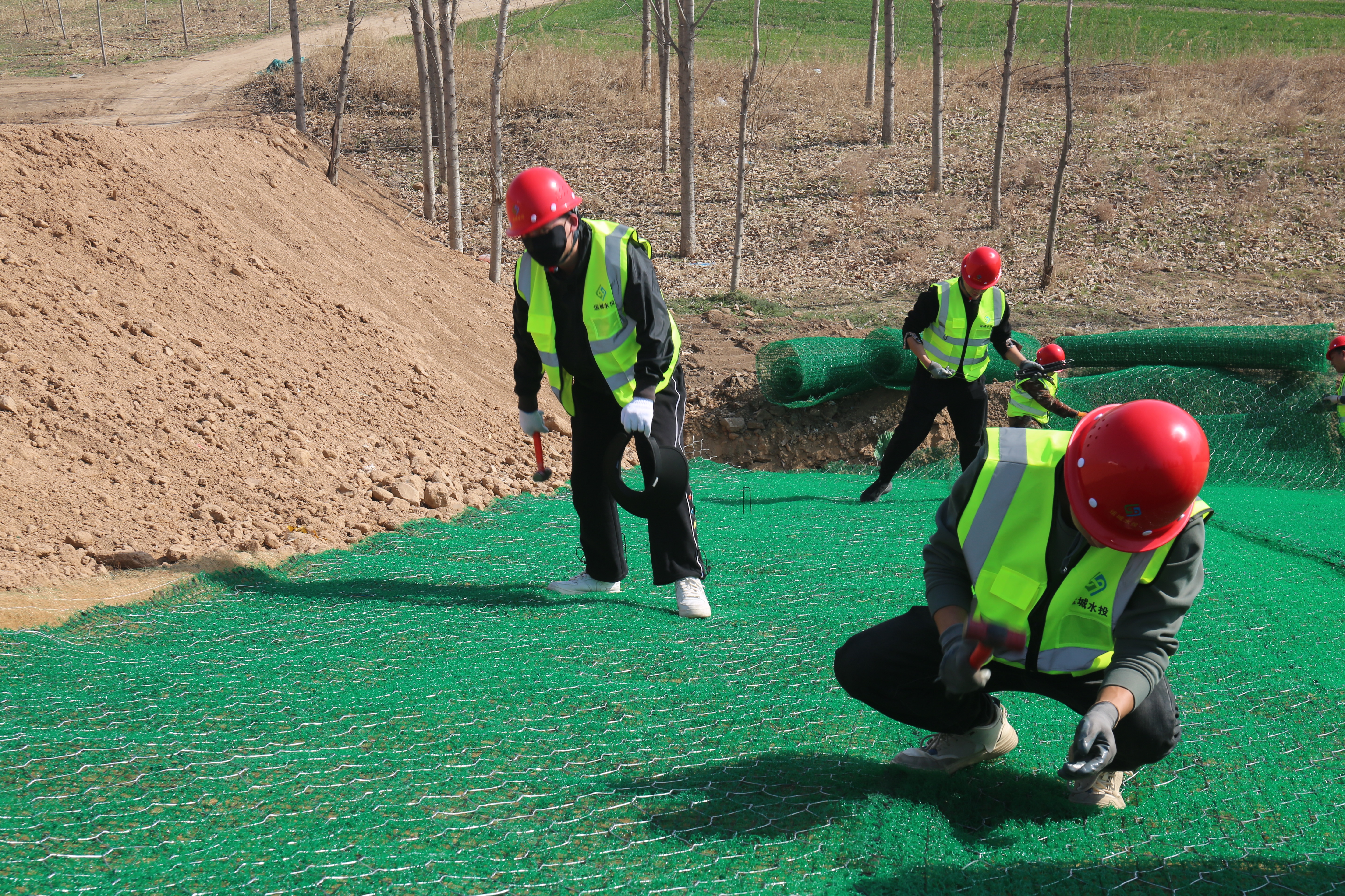 施工現(xiàn)場,工程機械、運輸車輛、施工人員正在加緊作業(yè)。一片片椰絲毯經過清除坡面雜物、坡度整修、開挖坑槽、播撒草籽等八道程序才能完好鋪設在大壩上。椰絲毯是一種新型環(huán)保材料,具有良好的吸水性、保濕性和透氣性,這種環(huán)保材料既可以起到穩(wěn)固河道邊坡、防止河岸沖刷破壞的作用,同時還能優(yōu)化生態(tài)環(huán)境。