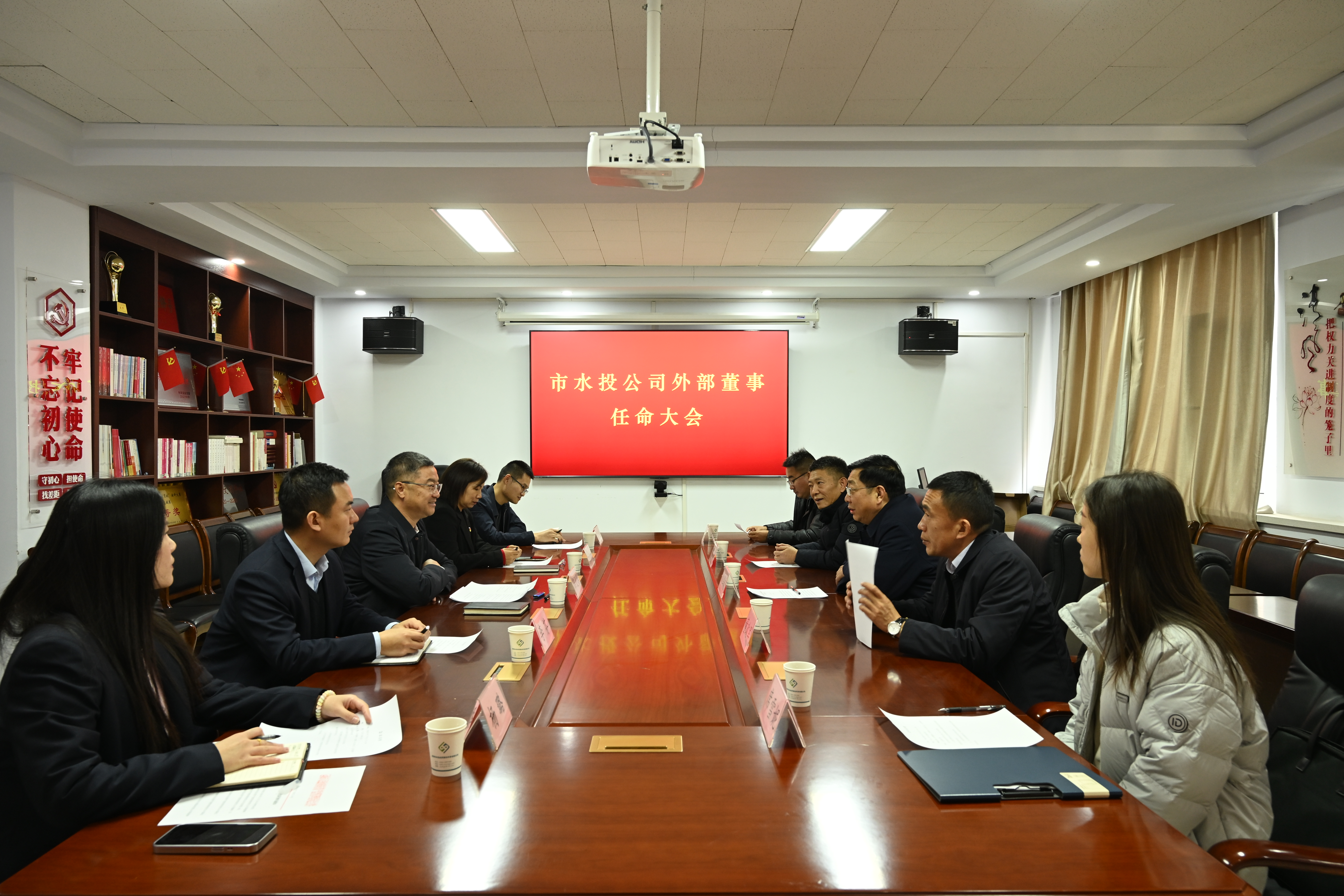 1月9日上午,市水投公司召開外部董事任命大會。市工信局黨組副書記、市國資委黨委專職副書記劉軍虎、國企黨建與企業(yè)領(lǐng)導(dǎo)管理科科長董政軍出席并講話。公司黨委書記、董事長薛文兵主持會議。