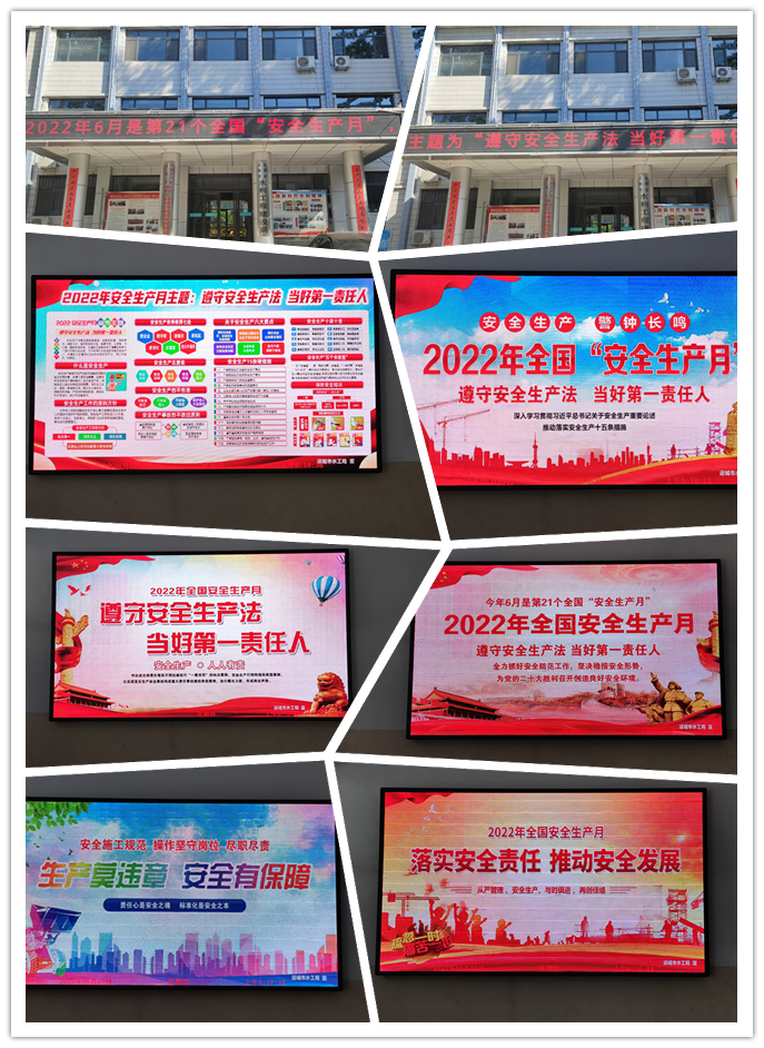 今年6月是全國第21個“安全生產(chǎn)月”,主題為“遵守安全生產(chǎn)法,當(dāng)好第一責(zé)任人”。為做好今年“安全生產(chǎn)月”的宣傳工作。近日,我公司通過門頭電子屏滾動播放宣傳標(biāo)語、室內(nèi)電子屏展示安全生產(chǎn)知識、微信群發(fā)放最新版《中華人民共和國安全生產(chǎn)法》,時刻提醒公司全體員工遵守安全生產(chǎn)法,履行安全生產(chǎn)責(zé)任制。